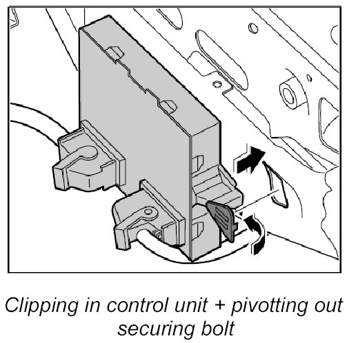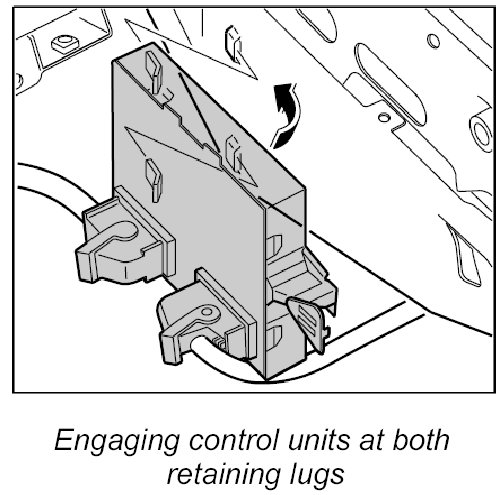 2. Engage control unit in support for wiring harness with both retaining lugs.
