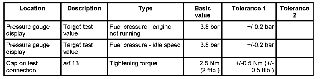9. Read value on pressure gauge. Fuel pressure - engine not running: 3.8 bar+/-0.2 bar