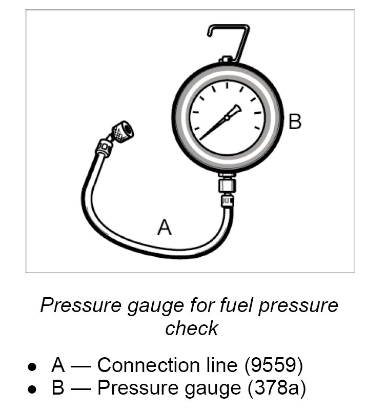 13. Loosen the union nut on the connecting cable 9559 for the pressure gauge 378a on the test connection and remove special tool. Collect escaping fuel with a cloth.