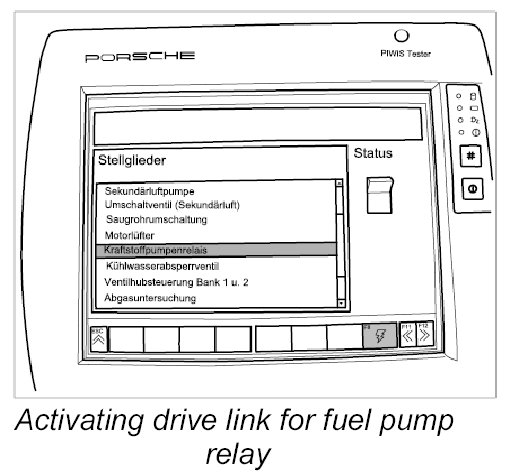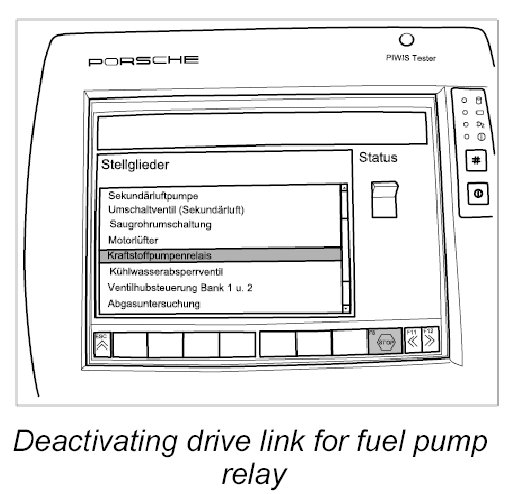 10. Deactivate the fuel pump relay on the PIWIS Tester by pressing F8 - Stop . Then, press F11 << to return to the start screen and switch off the Tester.