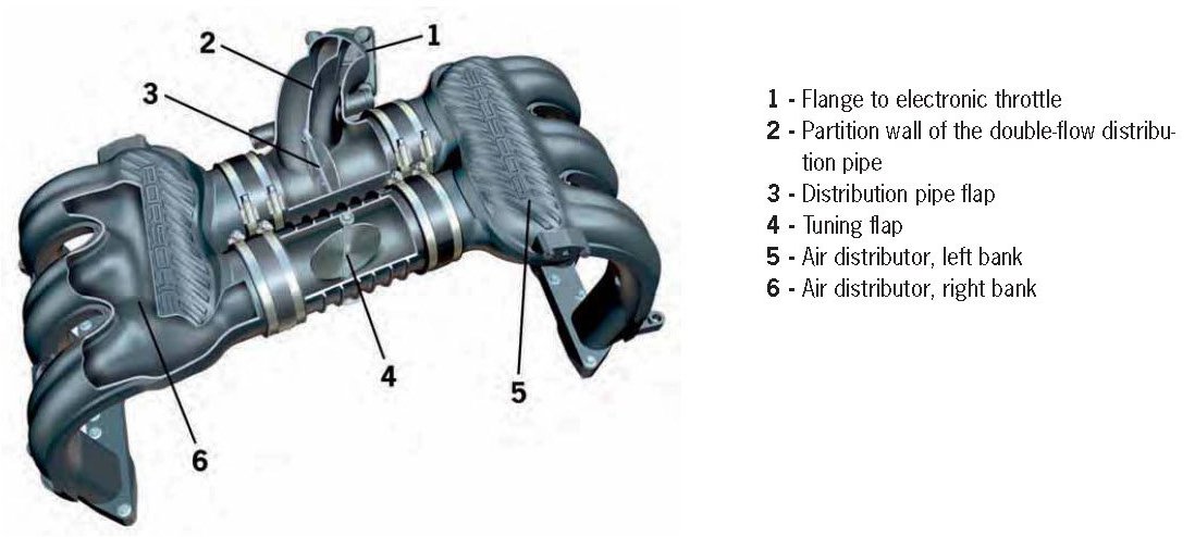 Similar to the Cayman S (987), the engine of the Boxster S is equipped with an intake system with a double-flow distribution pipe. With this system, the distribution pipe flap in the intermediate pipe connecting the two intake air distributors is closed in the low rpm range. The distribution pipe features a partition wall running along its length (between the electronic throttle and the distribution pipe flap in the intermediate pipe). In the low rpm range (with the distribution pipe flap closed) the 6-cylinder engine behaves like two 3-cylinder engines running in parallel, resulting in an improved torque characteristic in the low rpm range. The distribution pipe flap is opened in the 2 rpm ranges from 3,500 to 4,900 rpm and from 5,200 to 7,300 rpm.
