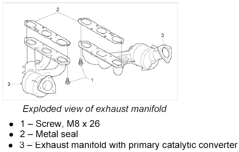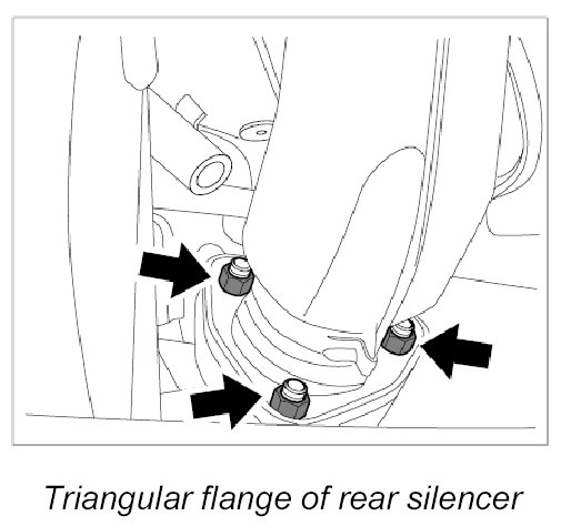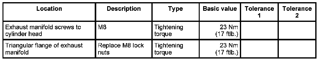 1. Secure triangular flange for exhaust manifold using three new M8 lock nuts. Tighten nuts evenly. - Tightening torque: 23 Nm (17 ftlb.)