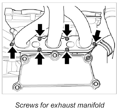 1. Remove the exhaust manifold. Unscrew six hexagon-head bolts (M8 x 26) -Arrows- on the cylinder head. Get another person to hold the component if necessary.