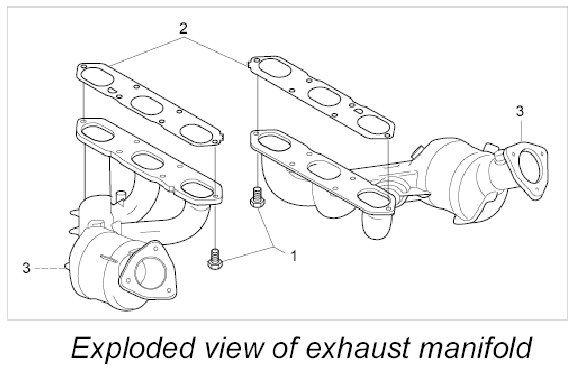 3. Fit exhaust manifold (with primary catalytic converter) -3- on the cylinder head and triangular flange with new metal seals. Get another person to help if necessary.
