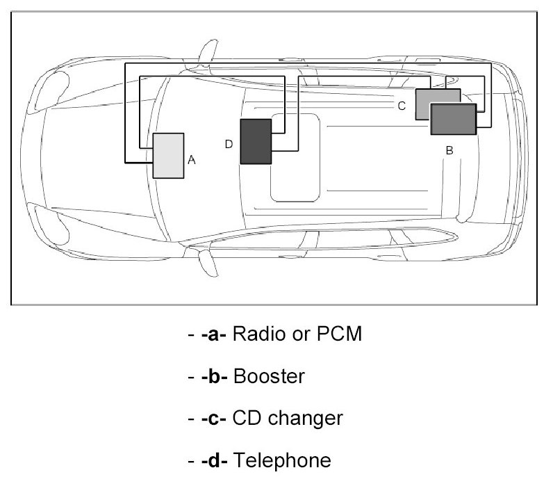 In all MOST control units, at least one sending diode and one receiver diode are installed. The sending diode of a MOST device is connected to a receiver diode of a 2nd MOST device. This results in a ring where the light signal is reinforced in each control unit (in each control unit, the light signal is transformed into an electrical signal).