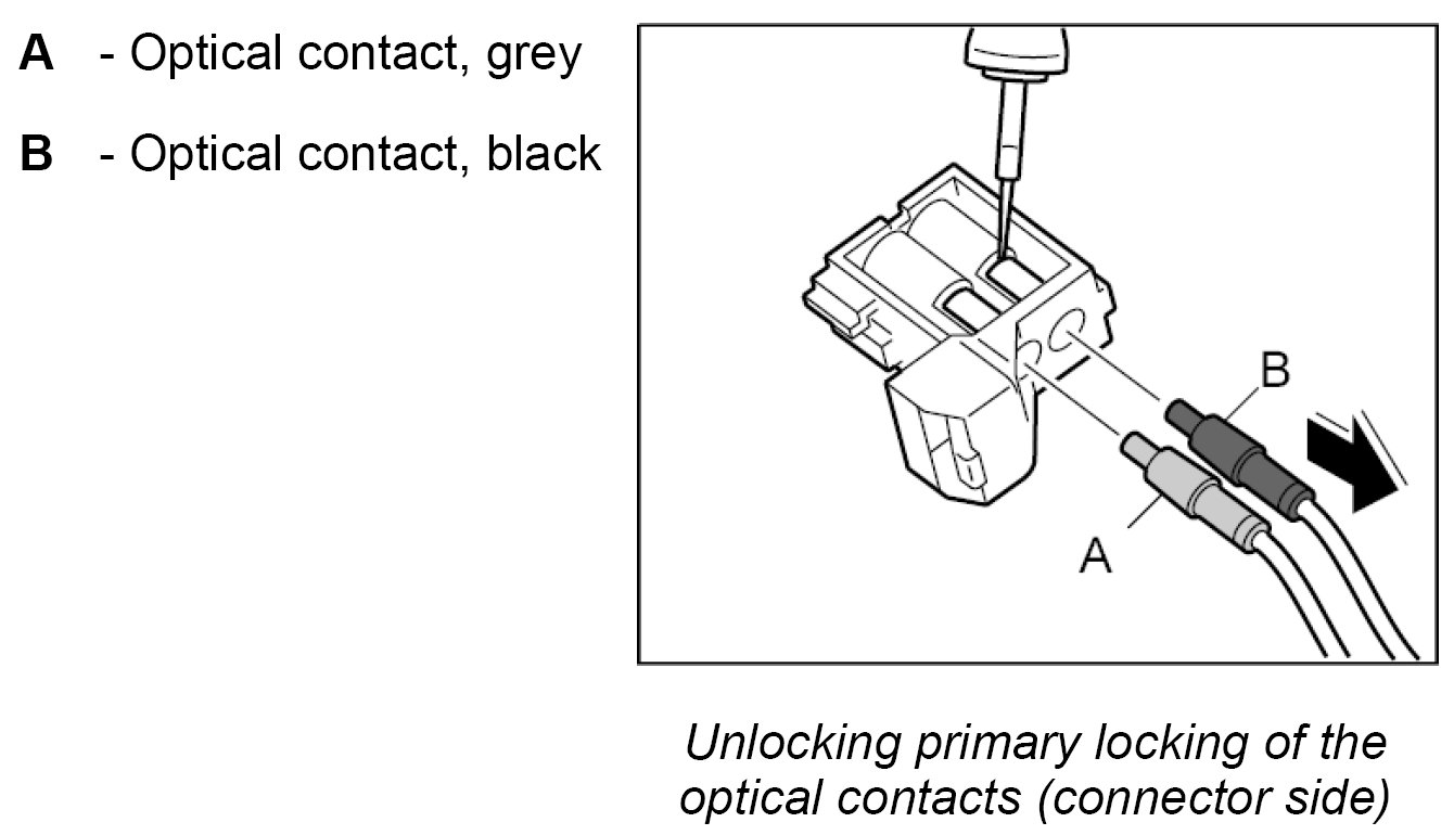 3. Carefully pull on the optical waveguide -A and B- in -direction of arrow-. If it is not possible to pull out the optical waveguide, check again if the secondary locking mechanism is completely released and if the primary locking mechanism is raised sufficiently.