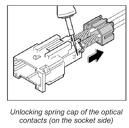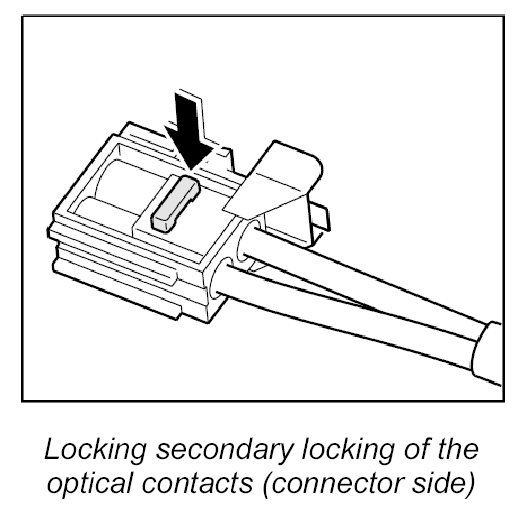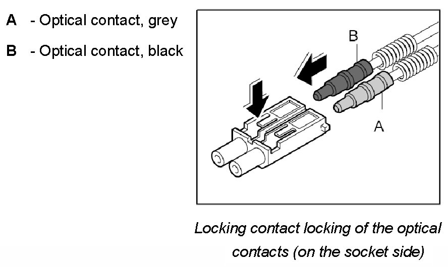 The LWL is delivered with affixed plastic contacts. These contacts are latched in the connector housing in the case of repairs. Grey and black contacts with identical mechanical dimensions are used.