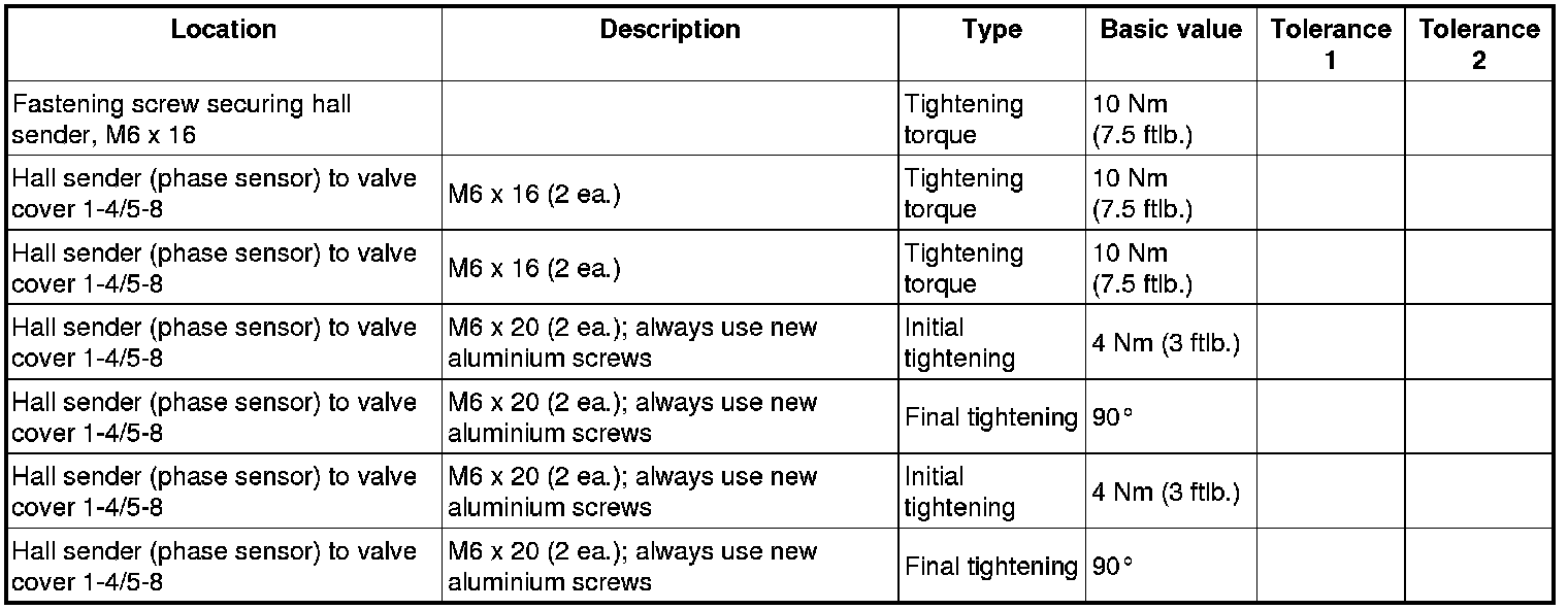 1. Fit the hall sender into the valve cover and tighten the fastening screw. => Tightening torque: 10 Nm (7.5 ftlb.)