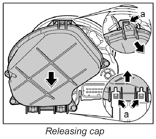 2. Release cap once at the top and twice at the bottom -a- and remove from the main headlight.