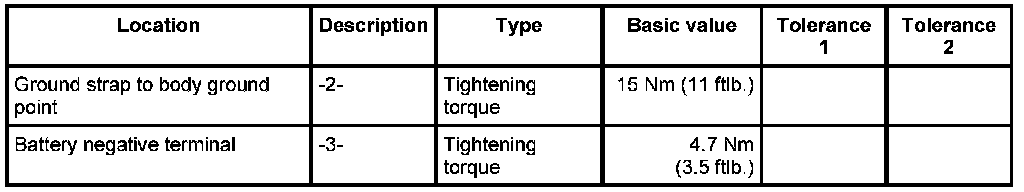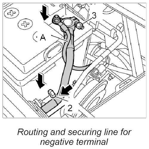 6. Fit ground strap for the negative terminal on the battery and screw it on securely -3-. - Tightening torque: 4.7 Nm (3.5 ftlb.)