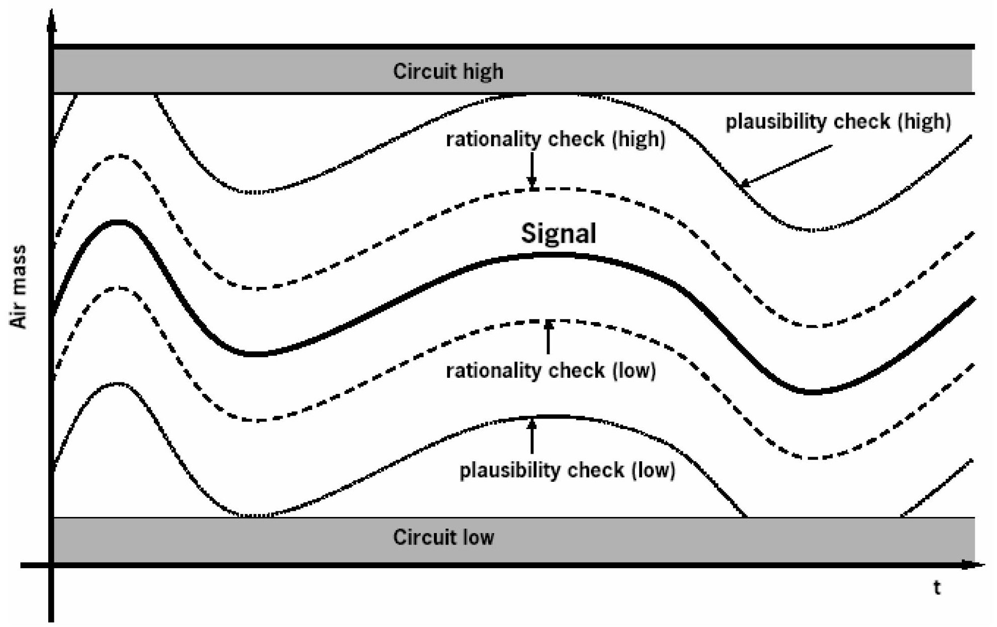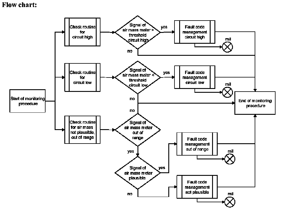 The output voltage of the air mass meter is a measure of air mass. The diagnostic routine compares the mass flow measured by the air mass meter with a calculated mass flow, derived from engine speed an throttle position.