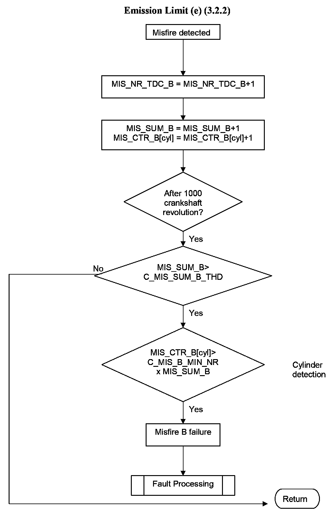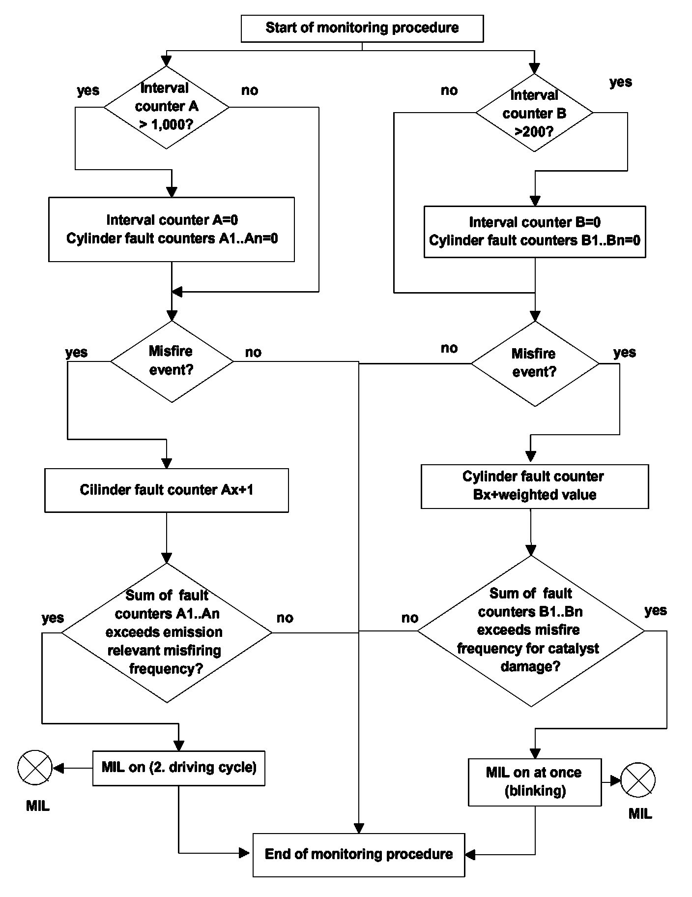 If the sum of cylinder(s) misfire counters within 1000 revolutions is 4 times exceeding a predetermined value during a driving cycle, or during the first 1000 revolutions, the fault code for emission relevant misfiring is temporary stored. If the following driving cycle is also above the emission limits, the MIL will be switched on and a cylinder selective or global fault will be stored.