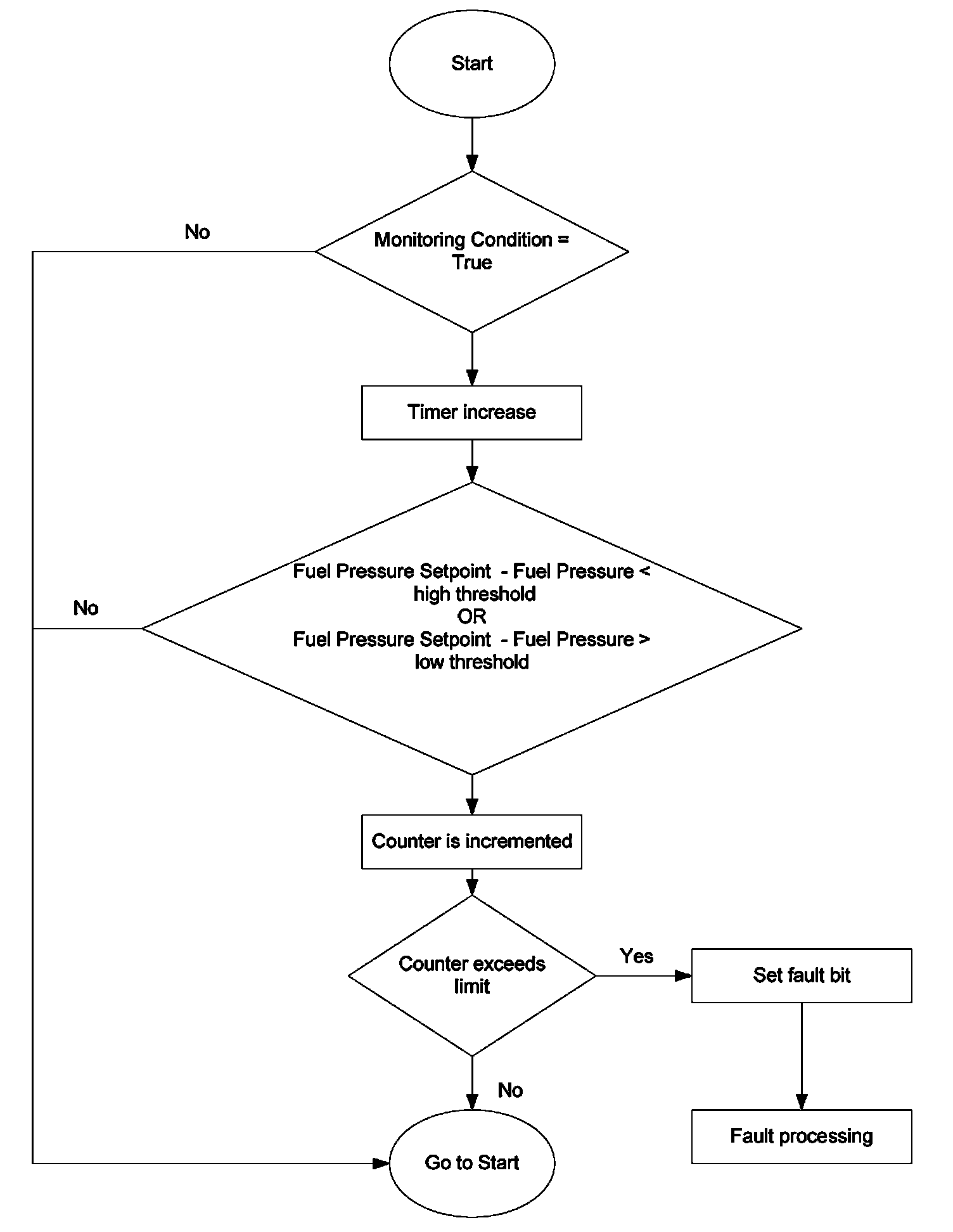 The fuel pressure monitoring checks the fuel pressure level in the fuel rail. The diagnosis compares the filtered fuel pressure with thresholds.