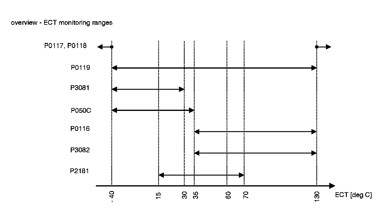 After engine start the system stores continuously the lowest and highest ECT. In case that after several driving conditions the difference between ECT max and ECT min is lower than the threshold the sensor stuck at high values.