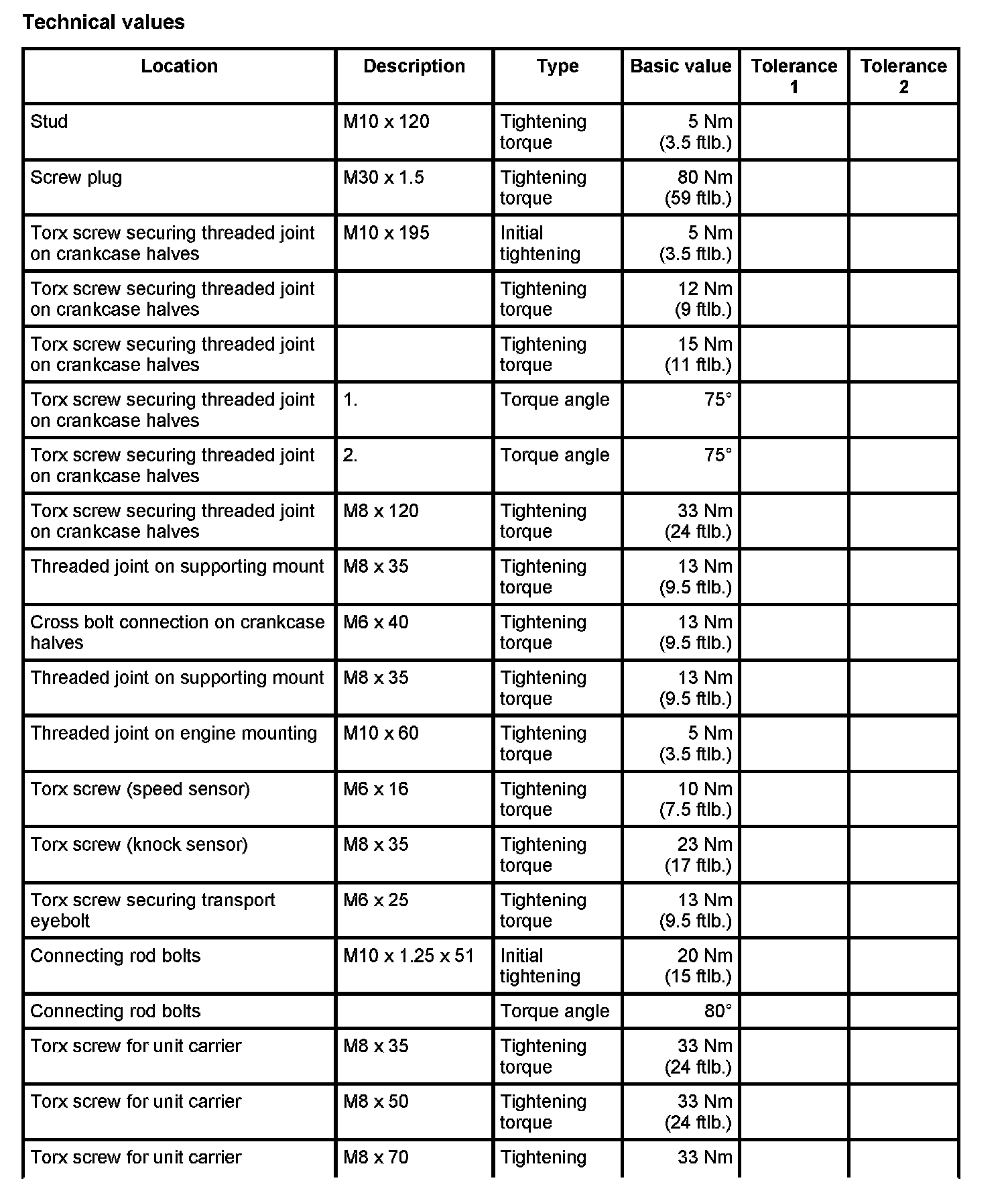 3 - Cylinder head screw - Initial tightening: 5 Nm (3.5 ft lb.) - Tightening torque: 50 Nm (37 ft lb.) Loosen all screws and then tighten them again - Initial tightening: 5 Nm (3.5 ft lb.) - Tightening torque: 12 Nm (9 ft lb.) - Torque angle: 60° - Torque angle: 60°
