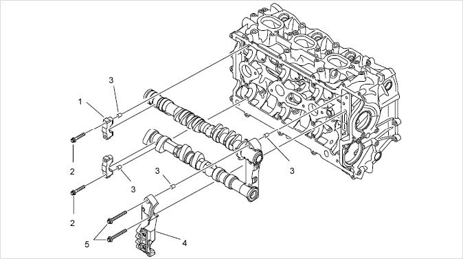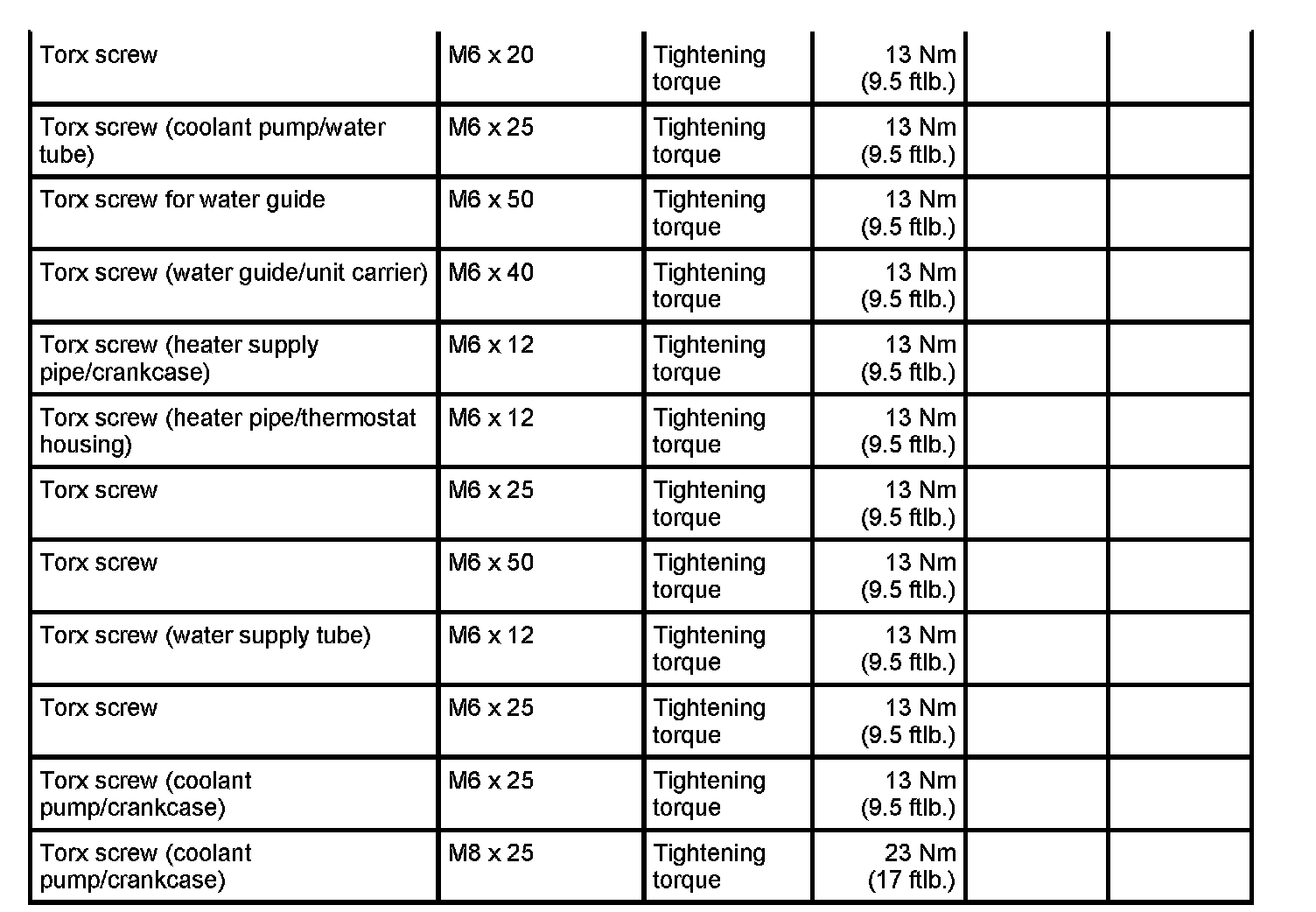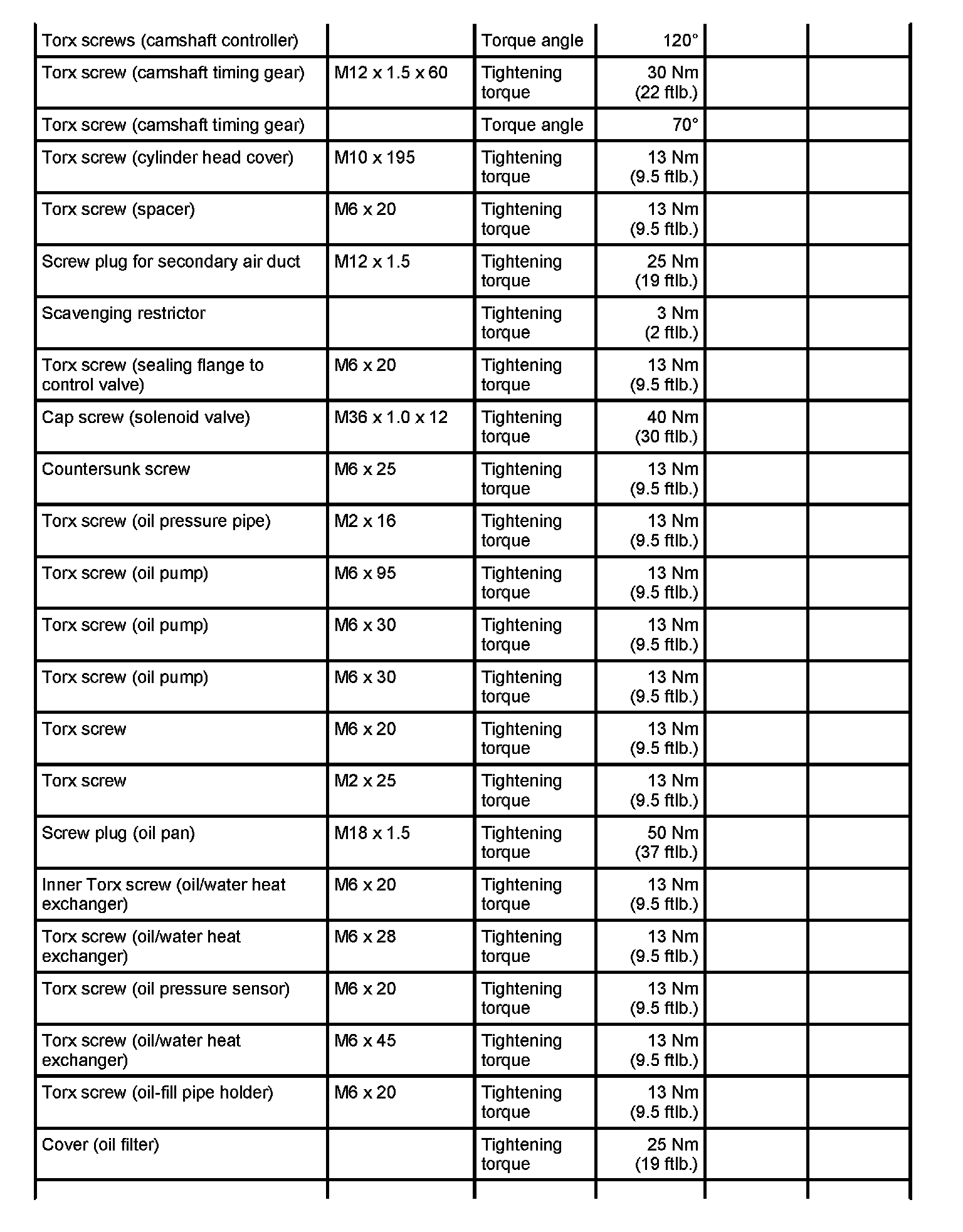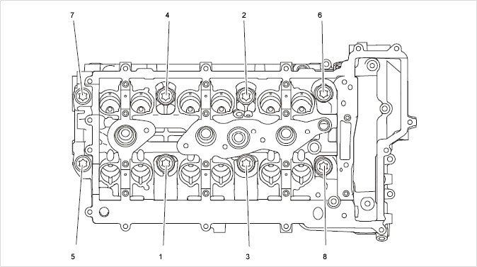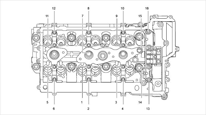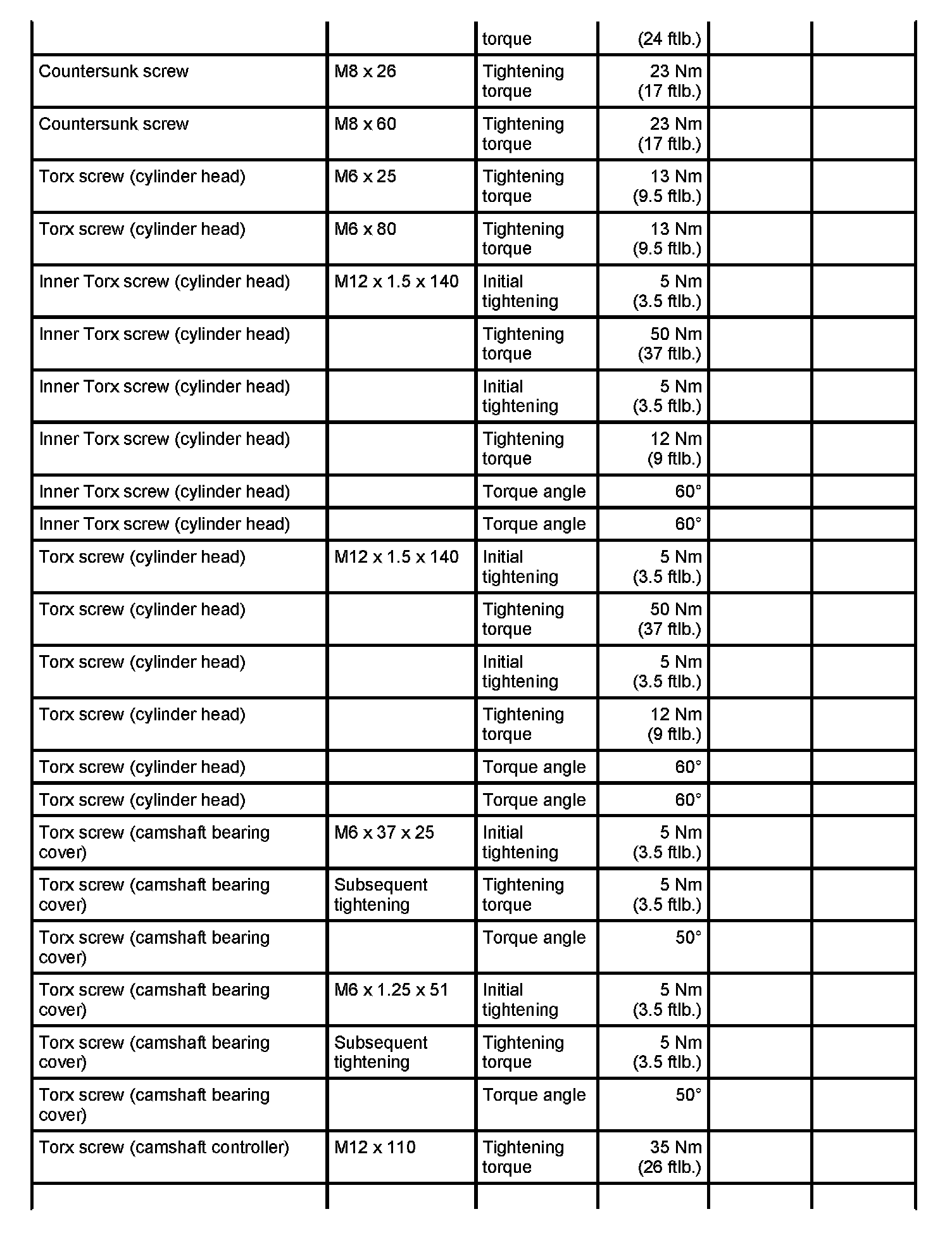 4 - Cylinder head screw - Initial tightening: 5 Nm (3.5 ft lb.) - Tightening torque: 50 Nm (37 ft lb.) Loosen all screws and then tighten them again - Initial tightening: 5 Nm (3.5 ft lb.) - Tightening torque: 12 Nm (9 ft lb.) - Torque angle: 60° - Torque angle: 60°
