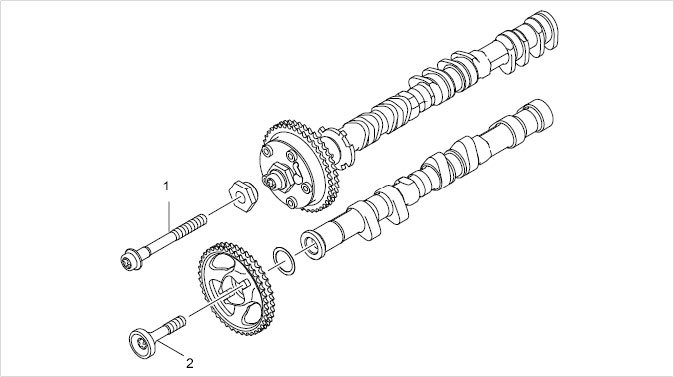 2 - Fastening screws for camshaft timing gear - Tightening torque: 30 Nm (22 ft lb.) - Torque angle: 70°