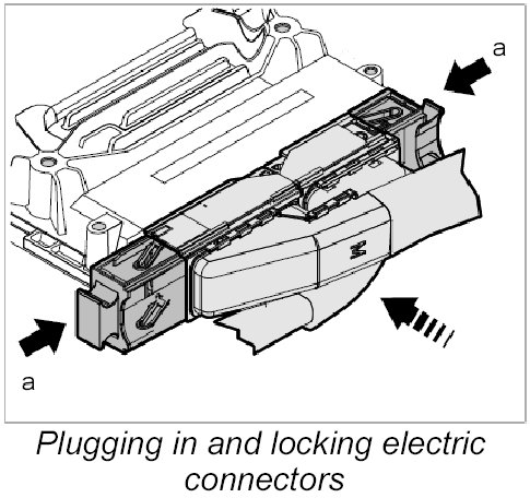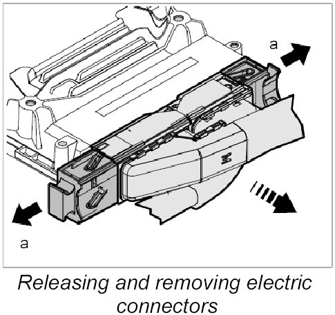 6. Release the two electric connectors -a- and pull them off the DFI control unit.