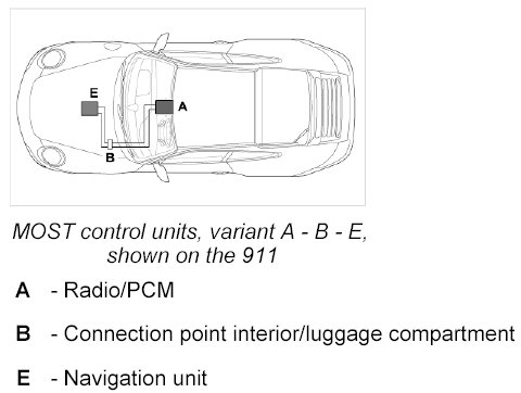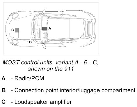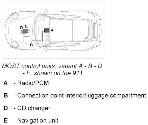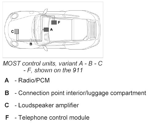 The graphic clarifies the cabling of the individual MOST control units which vary according to their equipment.