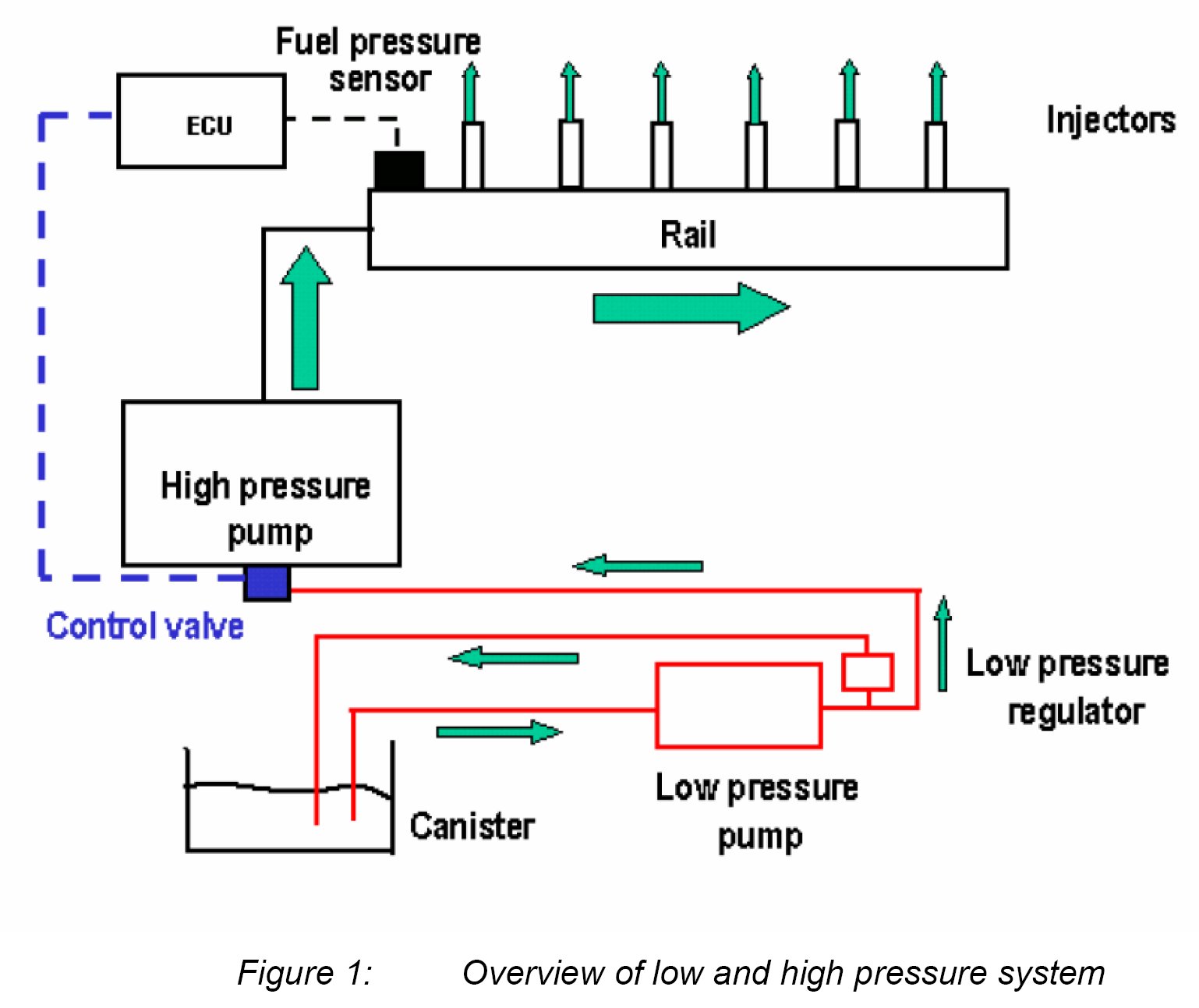 The high pressure system diagnosis consists of a rationality check and analyses in principle the difference between the fuel flow controller value and the lambda controller. The diagnosis finds out whether or not the set-point value of the fuel rail pressure can be adjusted by the high pressure fuel control.
