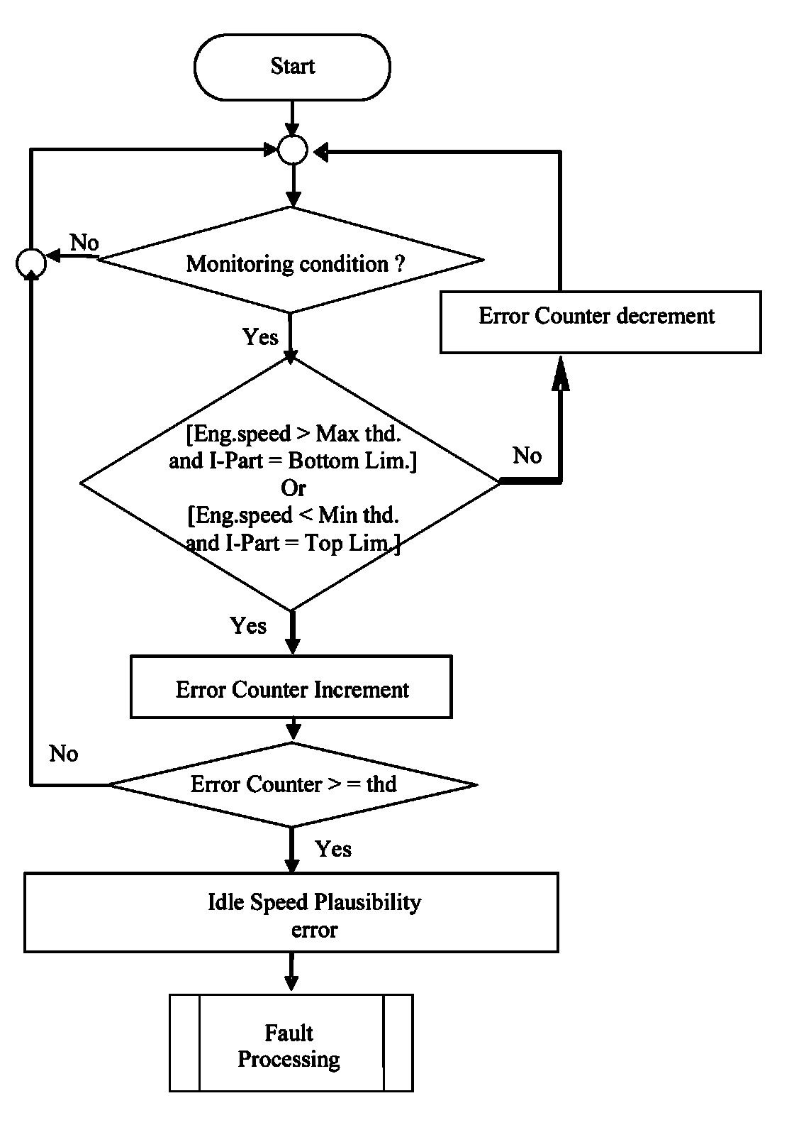 This diagnosis detects the stability of the idle speed. If the commanded idle speed and the actual idle speed is not within a calibrate able value, above or below commanded, in spite of an activated idle speed controller the idle speed is considered to be out of range.