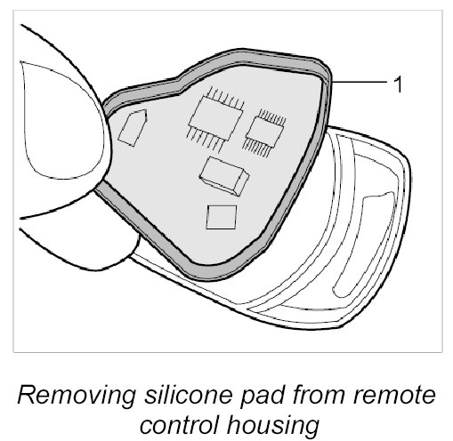 2. Remove silicone pad -1- with the printed circuit board (PCB) from the remote control housing.