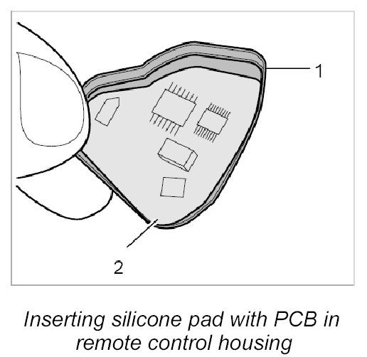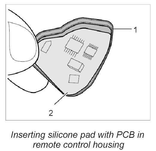 3. Insert silicone pad -1- with PCB into the remote control housing.