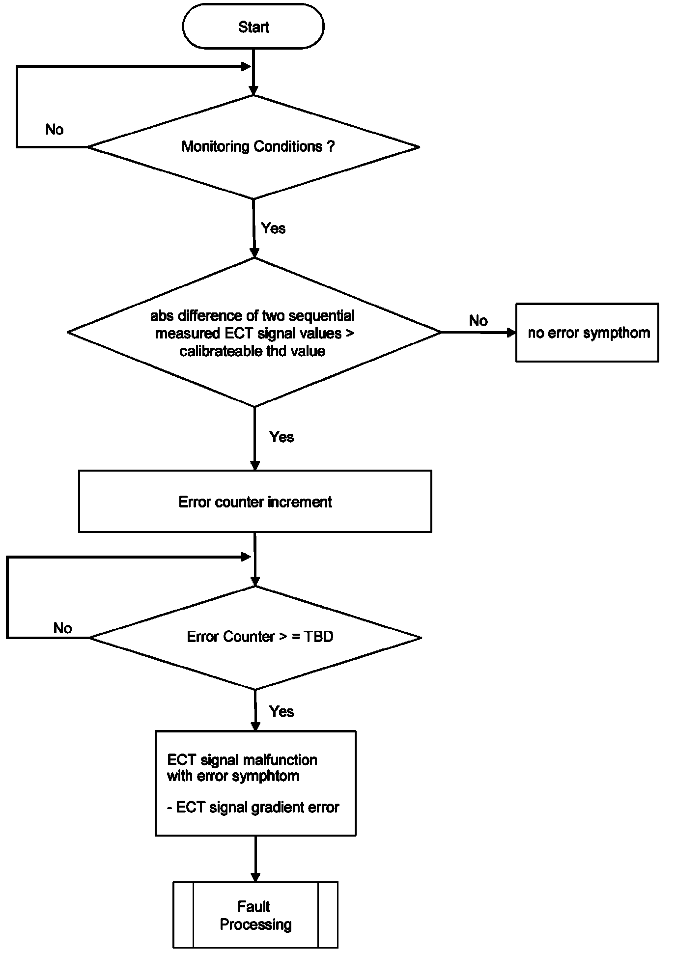 The purpose of this diagnosis is to detect electrical faults of the sensor signal. The input signal is analog from a NTC and has to be in a calibratable range. Short cut to ground can be detected immediately, short cut to voltage battery or open load after a delay time. If an error symptom is detected, the error counter is de-bounced.