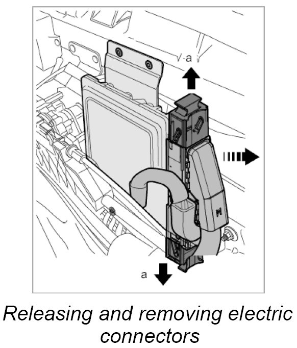 2. Release electric connectors -a- and pull them off the DFI control unit.
