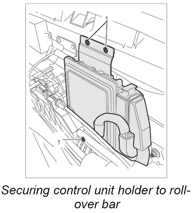 3. Fit the control unit holder and DFI control unit on the retaining frame for the roll-over bar and secure with the fastening screws -1-.