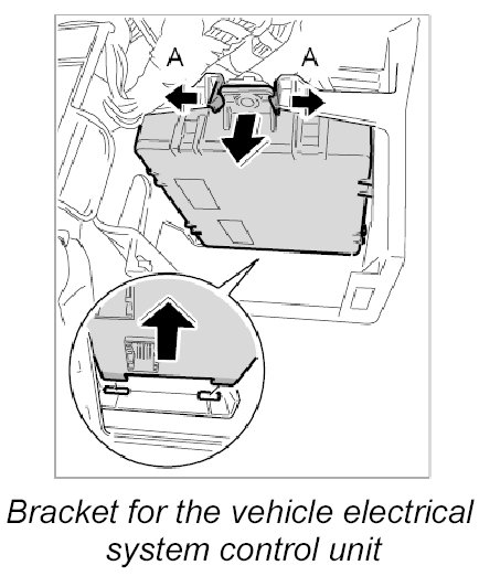 1. Pull apart the locking tabs -A- for the vehicle electrical system control unit, pull the control unit forward and down with connectors still attached then pull it out of its holder at the rear.