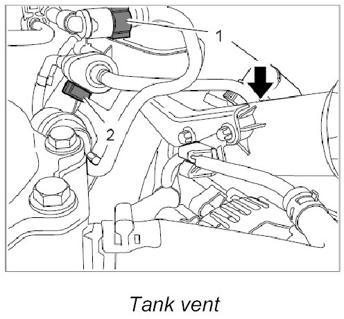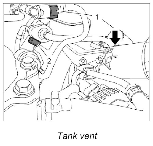 2.2. Clip in line at the resonance tube -arrow- and the feed line for the carbon canister -1-.