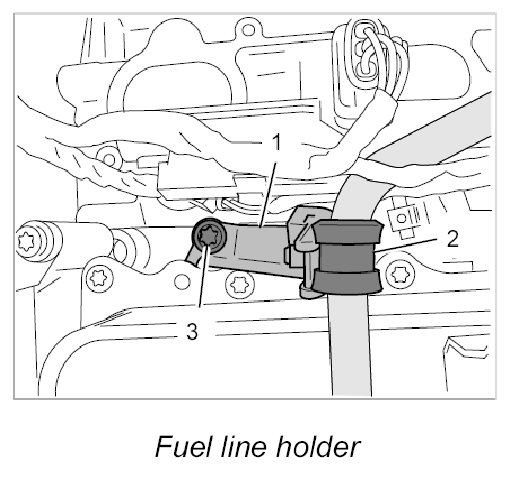 3.1. Unclip line at the resonance tube -arrow- and feed line for the carbon canister -1- and set them aside.