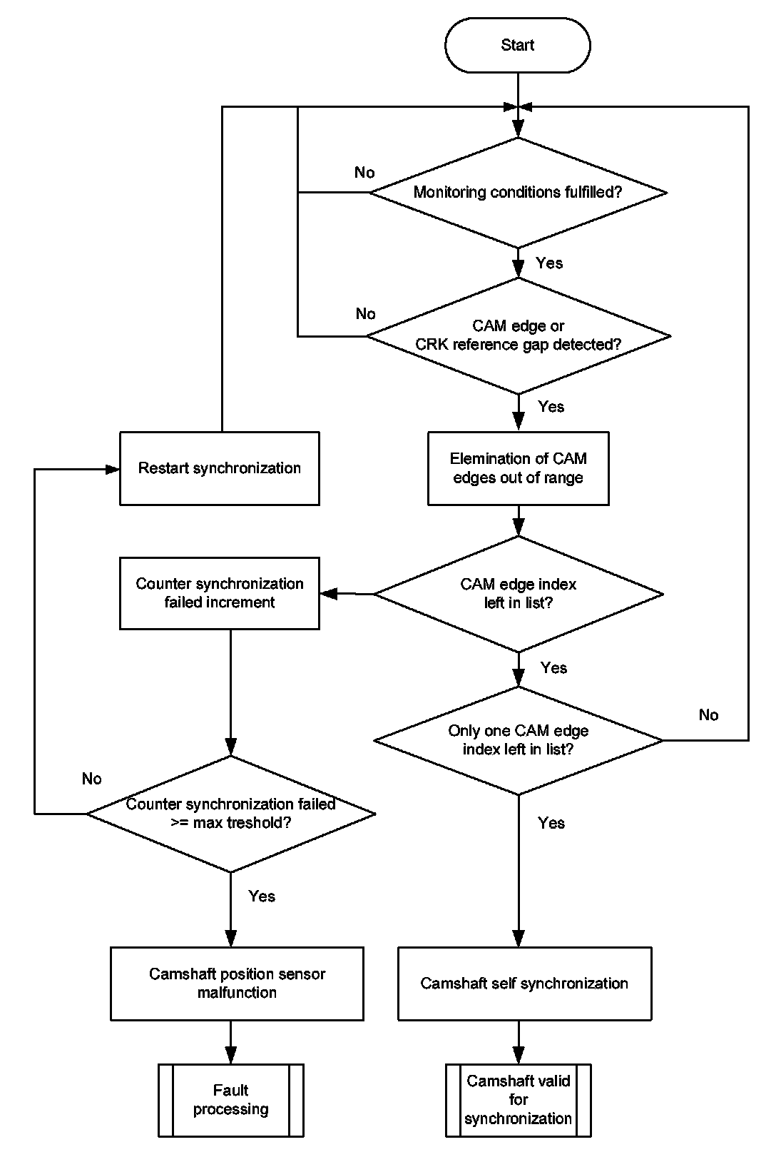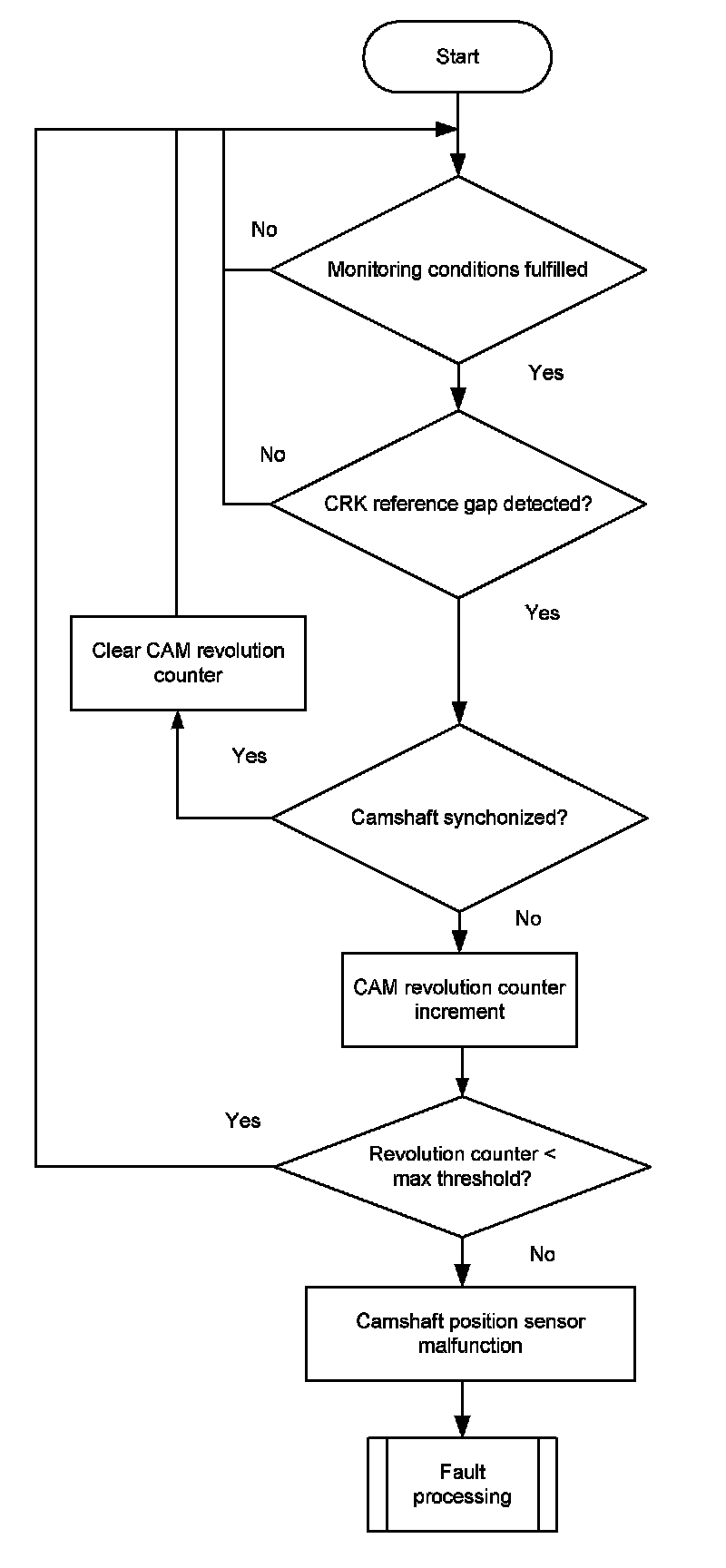 The monitor checks at every reference gap of the crankshaft sensor signal whether the camshaft is synchronized or not. If the camshaft is not synchronized, a revolution counter for the camshaft is incremented. When the counter reaches a threshold the error CAM sync is delivered to the error management.