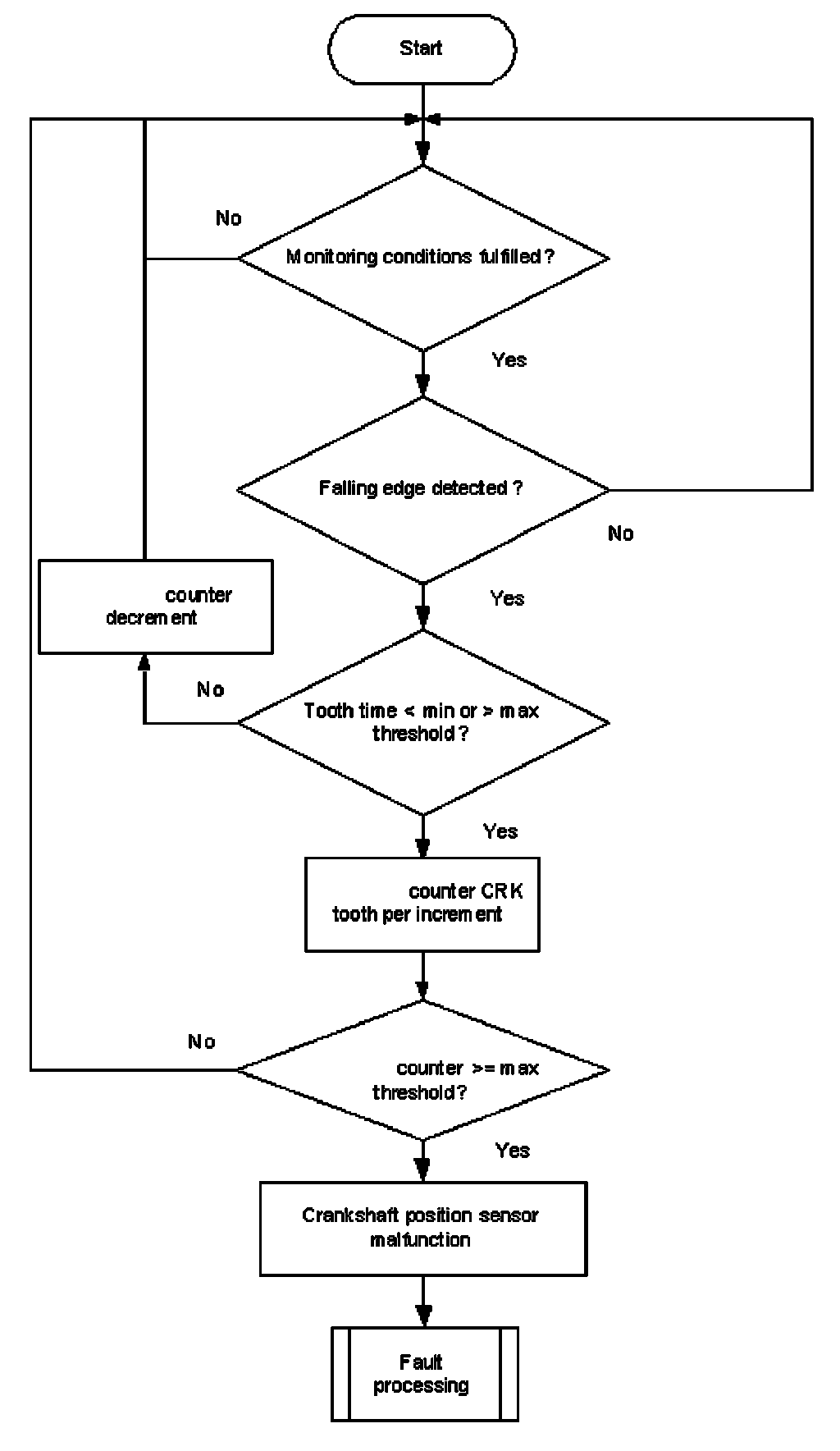 A teeth counter is incremented at every falling edge of the CRK sensor signal. If plus or minus one tooth is detected Flowchart diagnosis of mechanical reference position and diagnosis of chain jump. 360 °CA at the reference gap, the tooth number counter will be incremented. If the counter exceeds a limit, a CRK tooth error is delivered to the error management.
