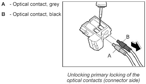 1. Release the connectors of the damaged optical waveguides on the affected components -Arrow a- and disconnect them. The illustration shows the connector on the CD changer as an example.