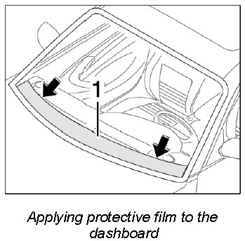 2. Apply protective film to the dashboard. Select the appropriate film -1- and insert between windscreen and damping mat.