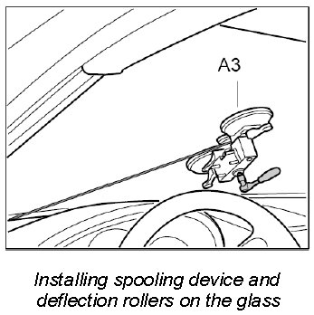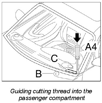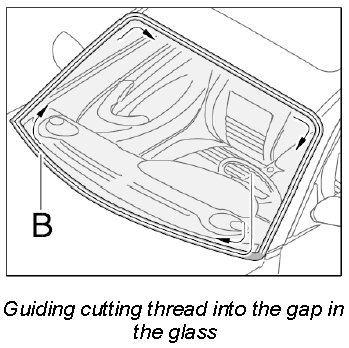 1. Pull cutting thread -B- in the direction of the arrow through the gap between the glass and the body. Use filler if necessary.