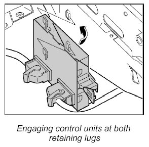 2. Engage control unit in support for wiring harness with both retaining lugs.