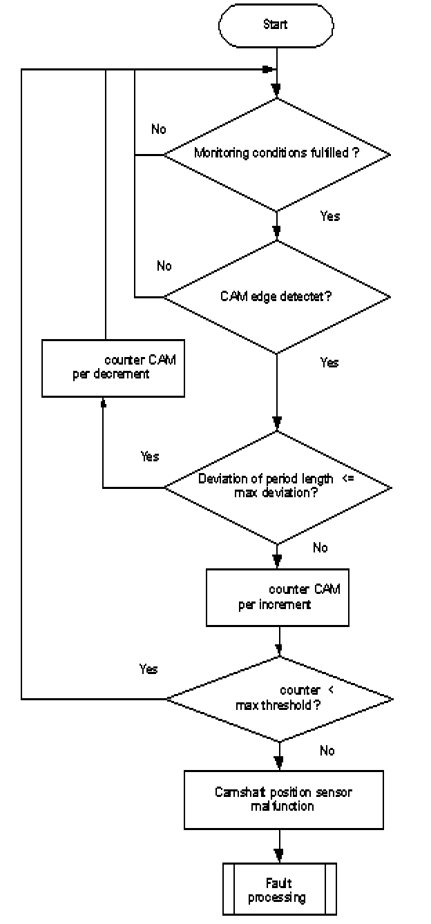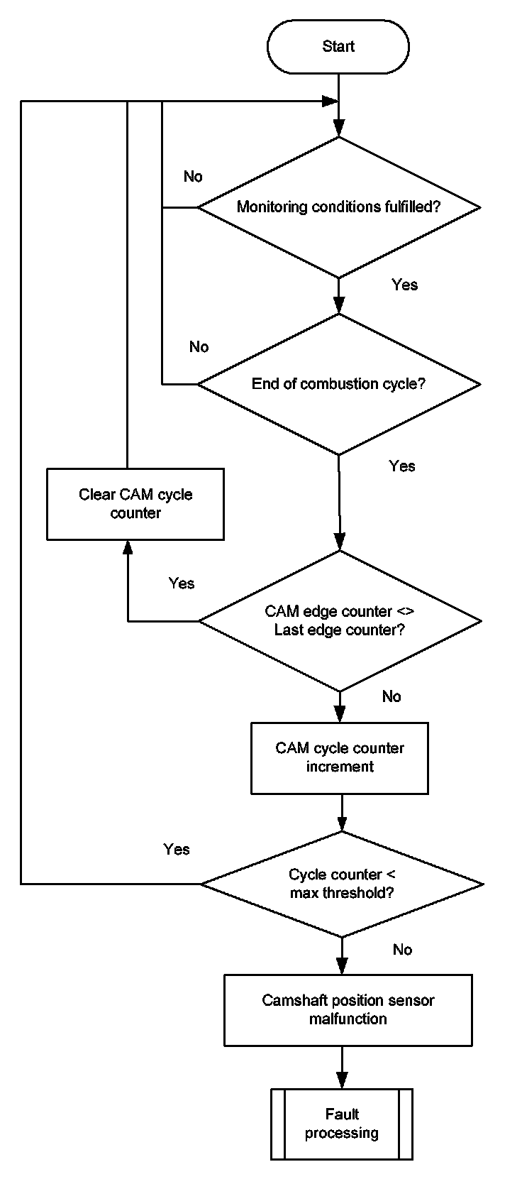 The monitor checks once per combustion cycle the edge counter of the camshaft. If the edge counter has not changed during the last cycle, a cycle counter is incremented. When the counter reaches a threshold, the error CAM_plaus is delivered to the error management.