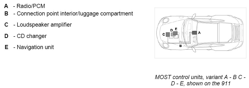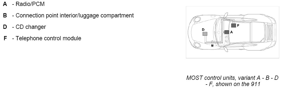 The graphic clarifies the cabling of the individual MOST control units which vary according to their equipment.