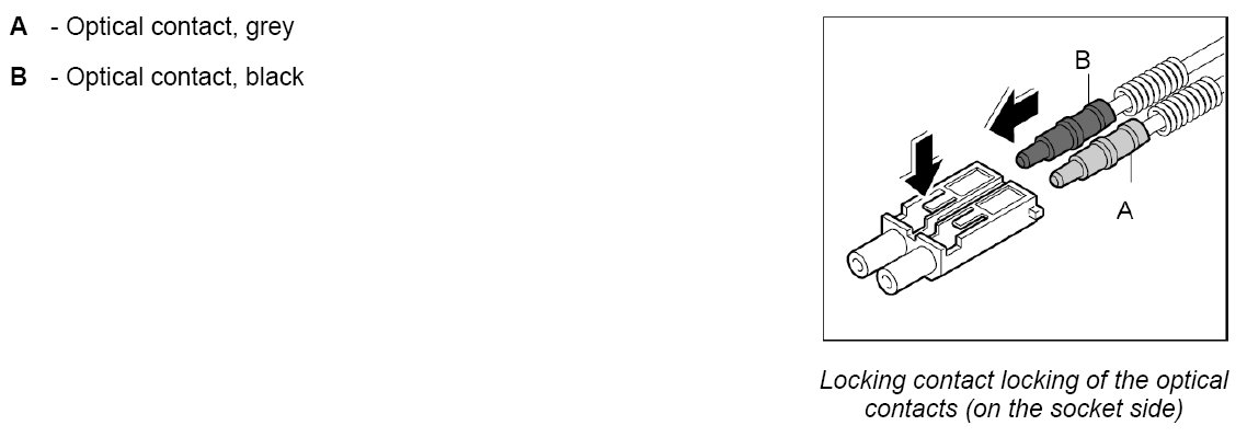 The LWL and the plug connections must not come into contact with fluids such as water, creeping compound, preservative, anti-freeze protection, cleaning agent. They will impair the MOST system function or cause complete system failure. Even plug connectors with plugged-in protective caps must not come into contact with the fluids listed.