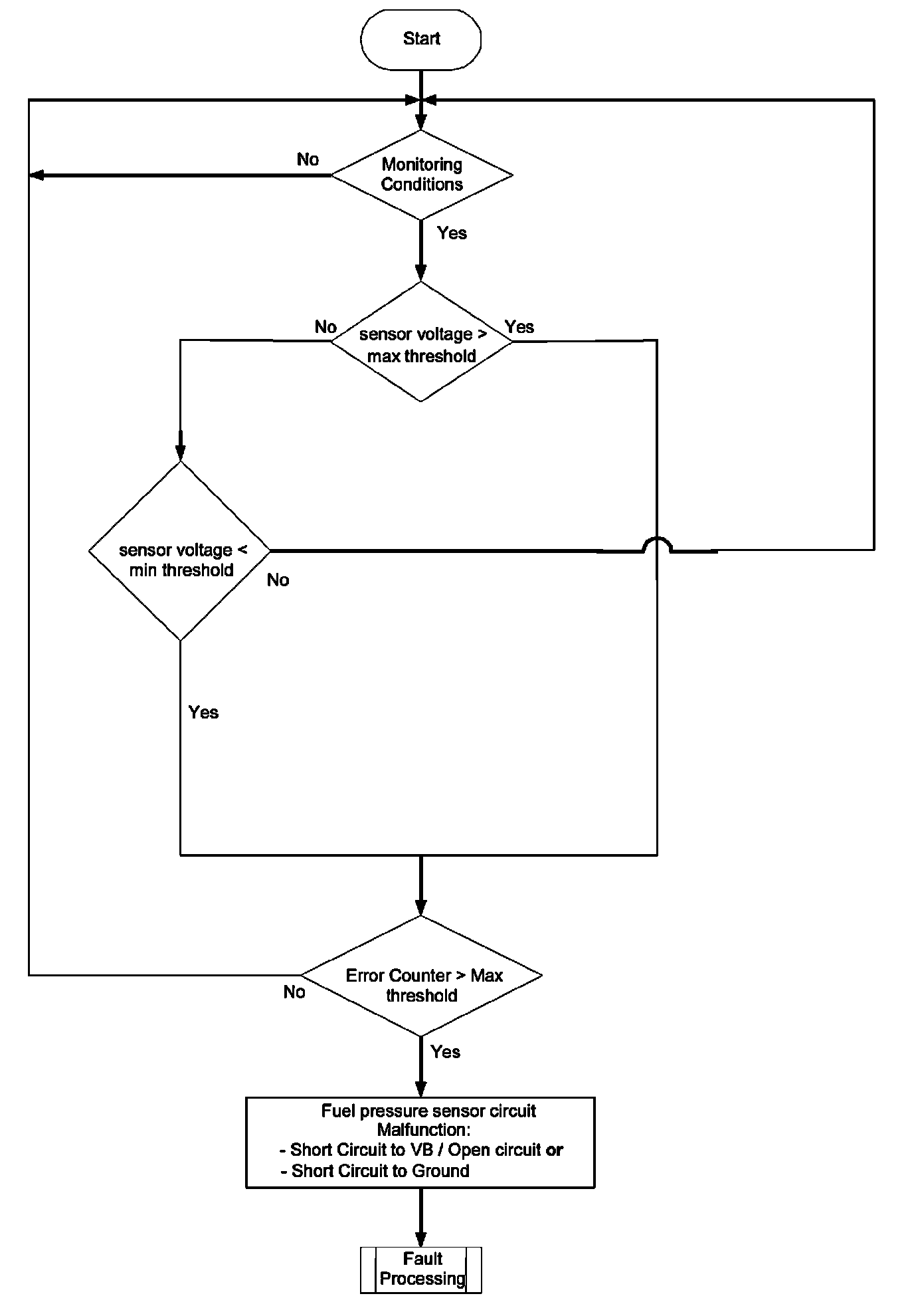 If the measured voltage from the fuel rail pressure sensor lies below the lower calibration limit, a short circuit to ground is detected and a minimum fault is set.