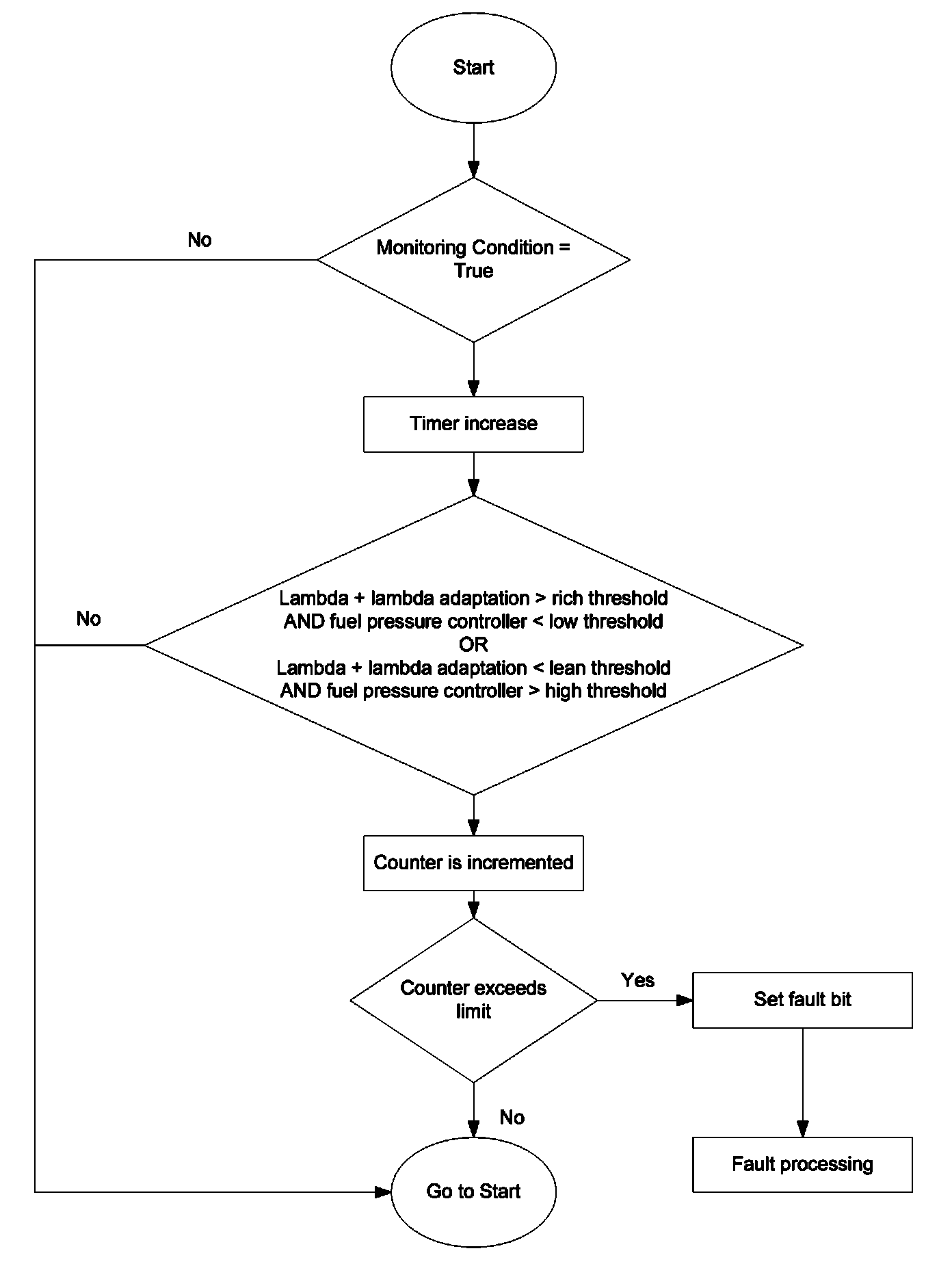The fuel mass plausibility diagnosis checks the plausibility of the high pressure sensor signal. The diagnosis compares the output of the lambda-controller and lambda-adaptation with the output of the closed-loop controller.
