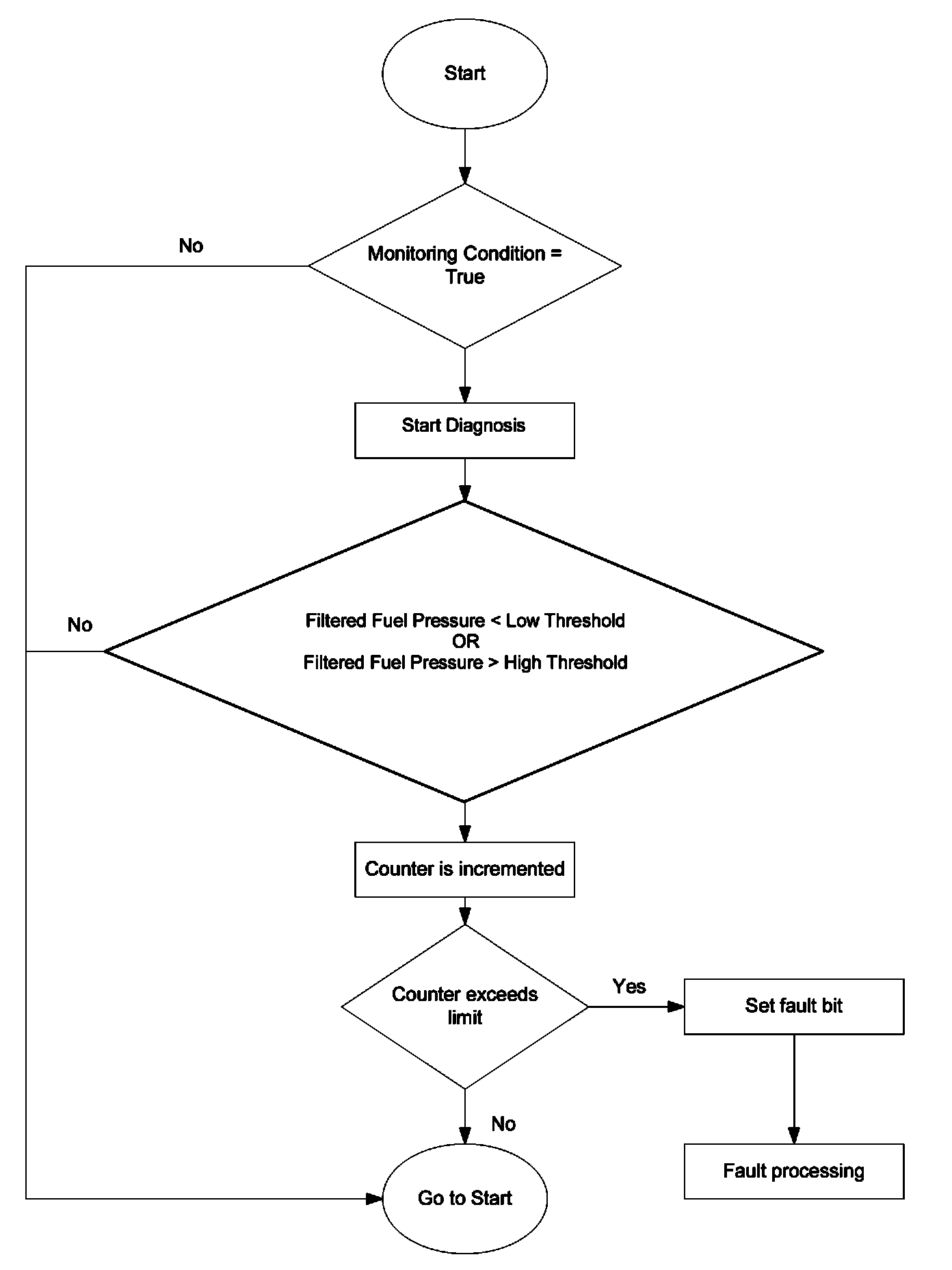 The fuel pressure monitoring checks the fuel pressure level in the fuel rail. The diagnosis compares the filtered fuel pressure with thresholds.
