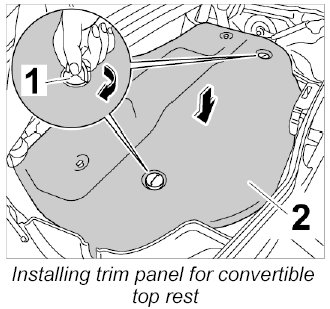 1. Position trim panel for convertible top rest -2- and fasten with the turn-locks -1- by turning in -direction of arrow-.