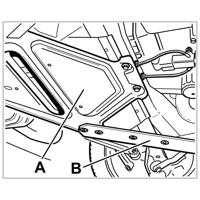 3. Remove right and left diagonal braces -B- and the support plate -A- (-> 421419 Removing and installing support plate - section on "Information"). Pull out the support plate -A- without undue force.