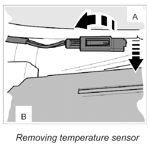3. Pull the temperature sensor forward (in direction of travel) out of the heater/air-conditioning unit and then pull it down.