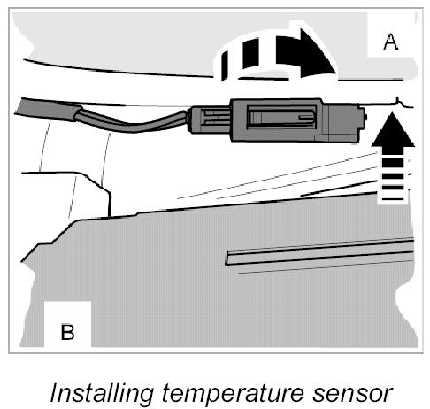 2. Guide the temperature sensor up between the bulkhead -B- and heater/air-conditioning unit -A-.