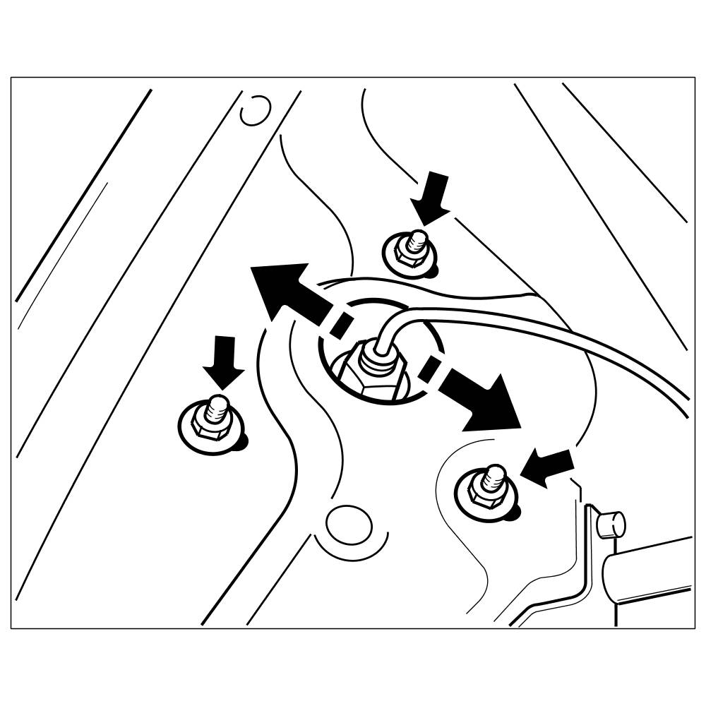 - Loosen three fastening nuts -Arrows- on the spring strut mount. Move the spring strut transversely until the desired nominal value is reached. To move the spring strut, remove the cap on the piston rod.